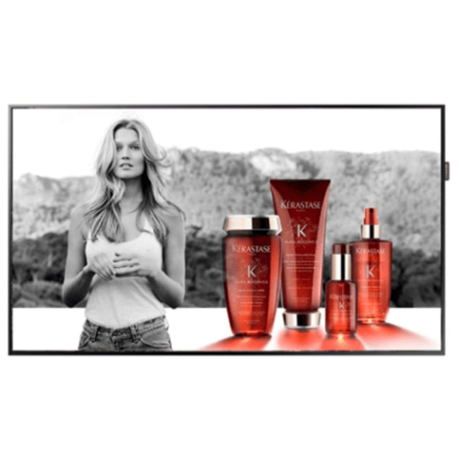 The kit includes: Samsung 65" Smart Display Monitor, INOVBOX Media Player and Wall Mount Bracket, The Samsung 65", 700 nit monitor is designed to be installed facing inside the salon, in areas that receive a high level of natural or artificial light to maintain crisp, clear images.